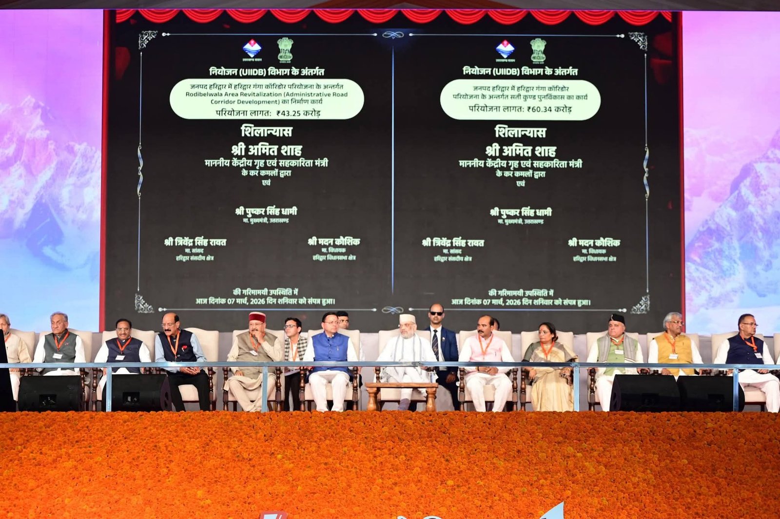 केंद्रीय गृह एवं सहकारिता मंत्री अमित शाह ने शनिवार को हरिद्वार में “जन जन की सरकार, चार साल बेमिसाल” कार्यक्रम के मौके पर ₹1129.91 करोड़ की विभिन्न योजनाओं का लोकार्पण और शिलान्यास किया। ₹1014.81 करोड़ की 22 योजनाओं का शिलान्यास और ₹115.10 करोड़ रुपये की 17 योजनाओं का लोकार्पण किया गया।